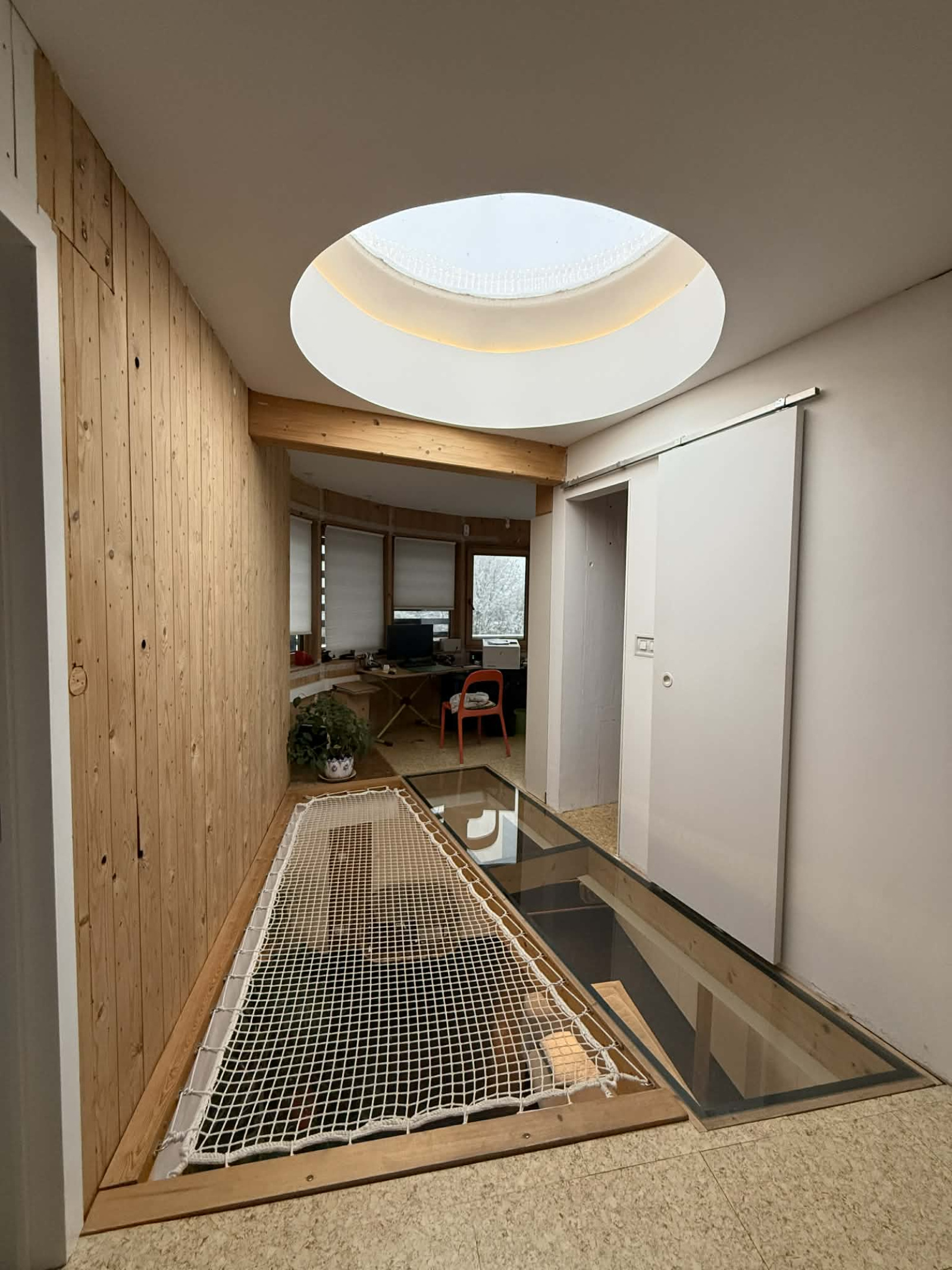 À l’étage, le design continue de surprendre avec un couloir filant menant à :